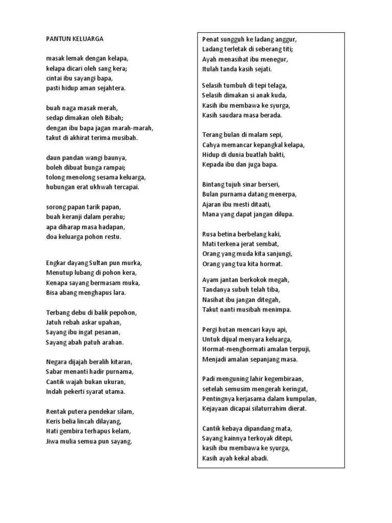 Pengucapan pantun kasih sayang ibu bapa. Jangan kita berbuat dosa, kelak akan dapat balasannya. Pantun kasih sayang ibu bapa. Pantun kasih sayang ibu bapa. Kumpulan pantun berbakti kepada orang tua / pantun menghormati ayah ibu. Petik sayur si daun bidara,. Kalau tuan ke bukit sentosa, belikan saya pari nyonya; Untuk senantiasa patuh dan hormat kepada ayah ibu tercinta. Hormat menghormati bahasa melayu komunikasi pendidikan khas tingkatan 4. Dua rangkap pantun di atas molek menggambarkan keperibadian isteri saya, bukan memuji tetapi itulah cerminan jiwa beliau.